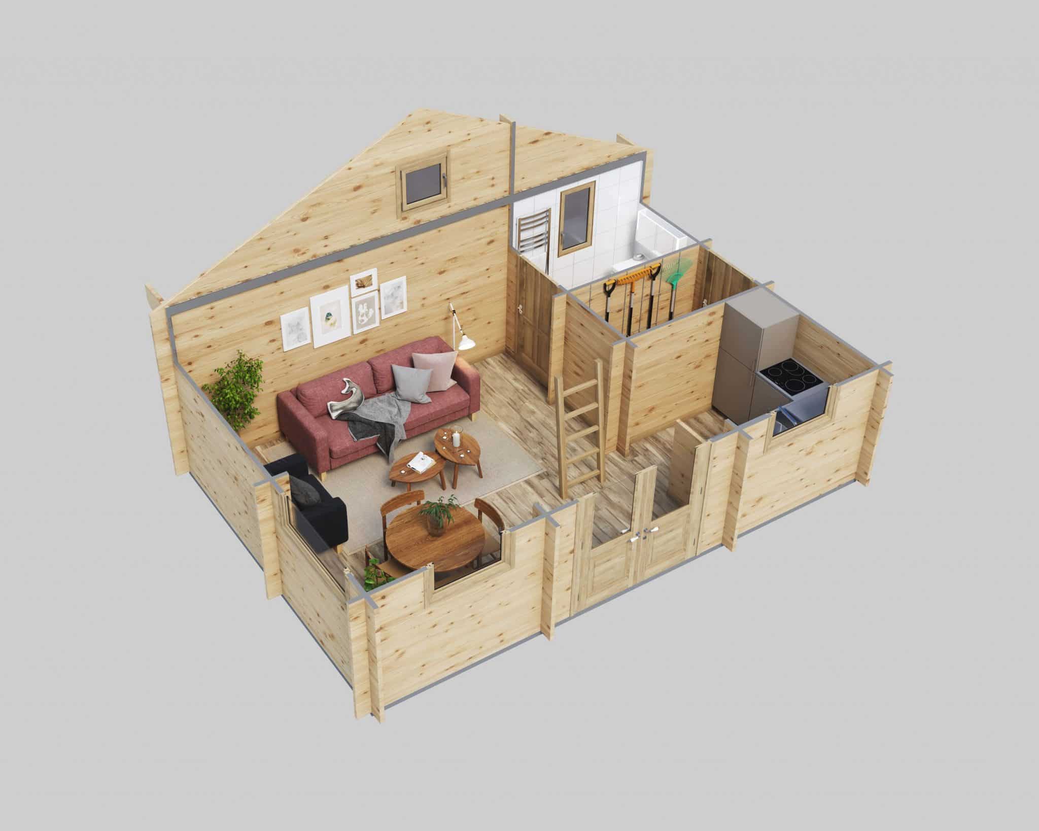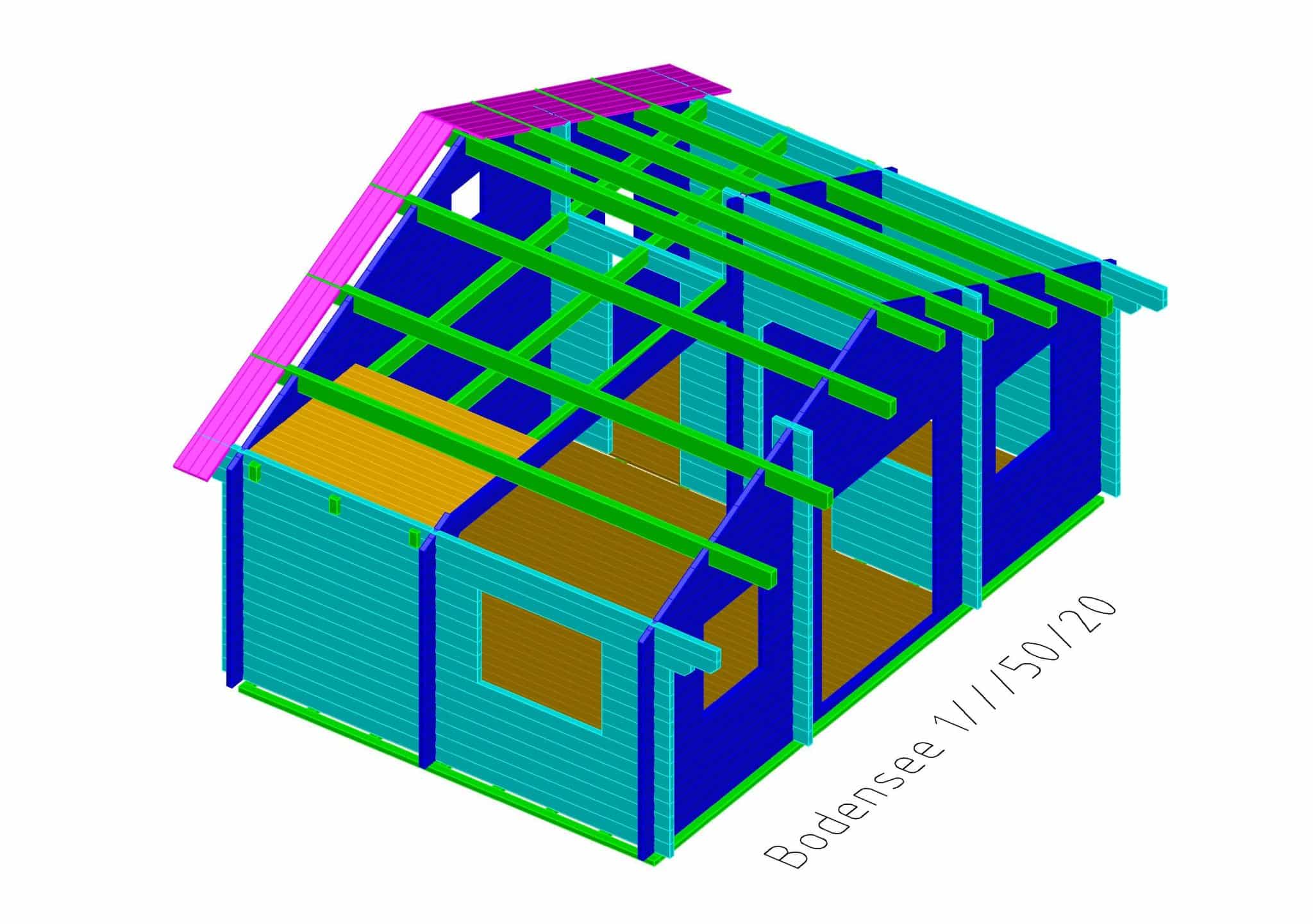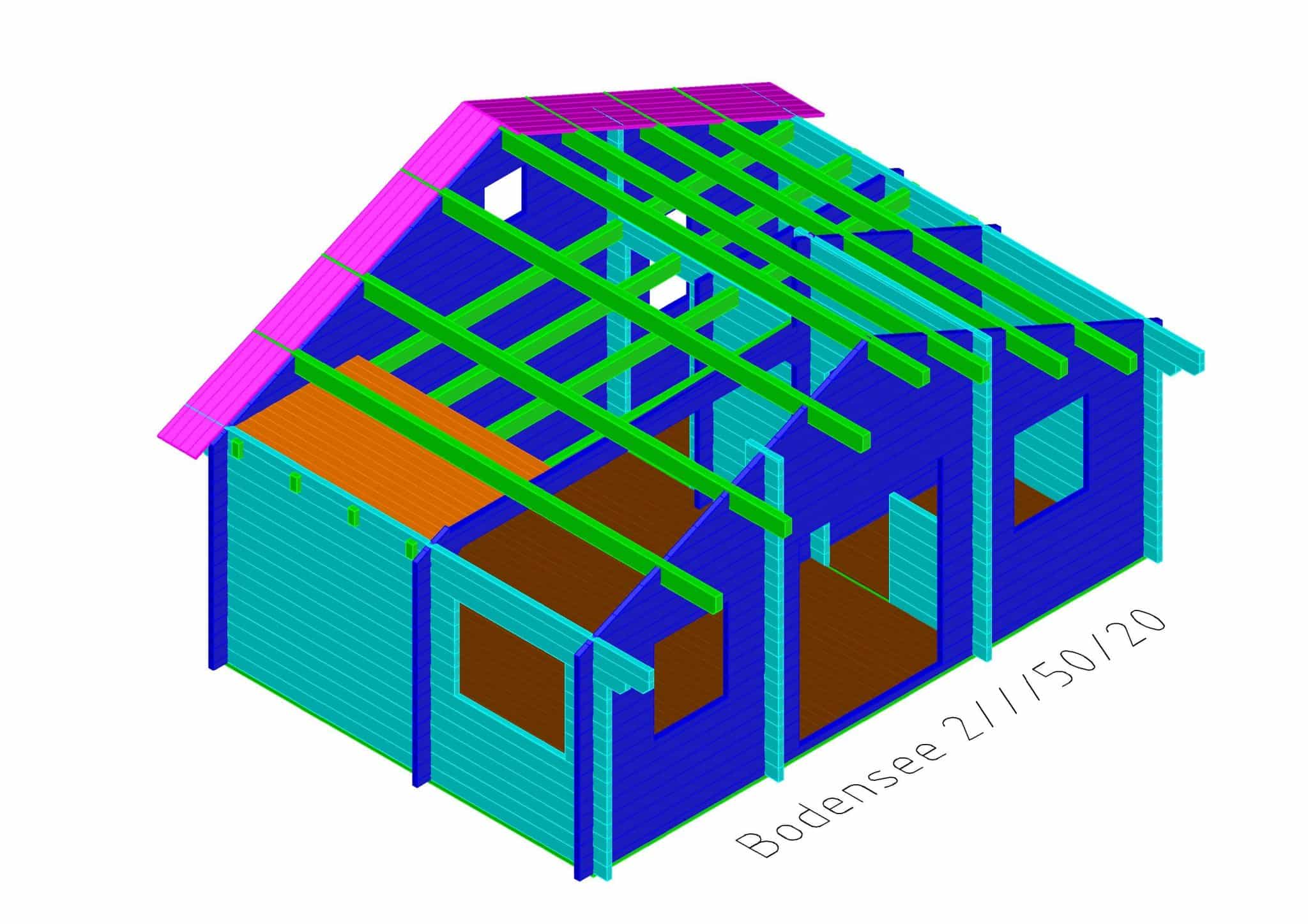 Das Gartenhaus Modell „Bodensee“ mit Schlafboden zählt zu unseren Favoriten. Insbesondere Kleingärtner schätzen es, da es den deutschen Kleingartengesetz-Richtlinien entspricht. Mit 24 m² Grundfläche, 3,50 m Firsthöhe und etwa 2,20 m Traufhöhe erfüllt es alle relevanten Vorgaben. Es ist nicht nur im eigenen Garten vielseitig einsetzbar, etwa als Garten- oder Gästehaus. Die 2. Variante des Blockhauses Bodensee verfügt über einen nur von außen zugänglichen Geräteraum. Üblicherweise wird es mit 50 mm Blockbohlen mit doppelter Nut und Feder konstruiert, was ein stabiles Schlafbodenhaus für die Hauptsaisons ergibt. Mit 70 mm Blockbohlen und optionaler Dach- und Bodenisolierung ist auch ein Winterwochenende darin machbar. Es ist auch in 94 mm Blockbohle erhältlich, wobei größere Wandstärken den Innenraum verkleinern.