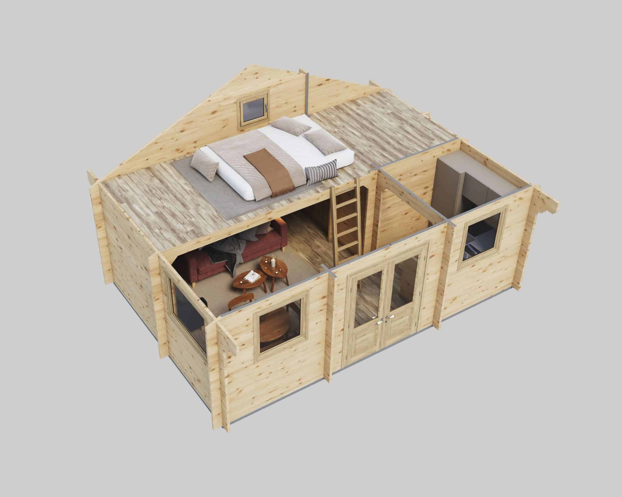 Für alle Schlafbodenhäuser, einschließlich dieses, bieten wir optional Deluxe-Fenster und -Außentüren an, die durch eine stabile, verleimte Rahmenkonstruktion, einen Einhand-Dreh-Kipp-Mechanismus bzw. eine 3-Fach-Verriegelung überzeugen. Natürlich sind auch individuelle Anpassungen und Ausstattungsfeatures möglich. Holen Sie sich noch heute Ihr unverbindliches Gesamtangebot von uns!
