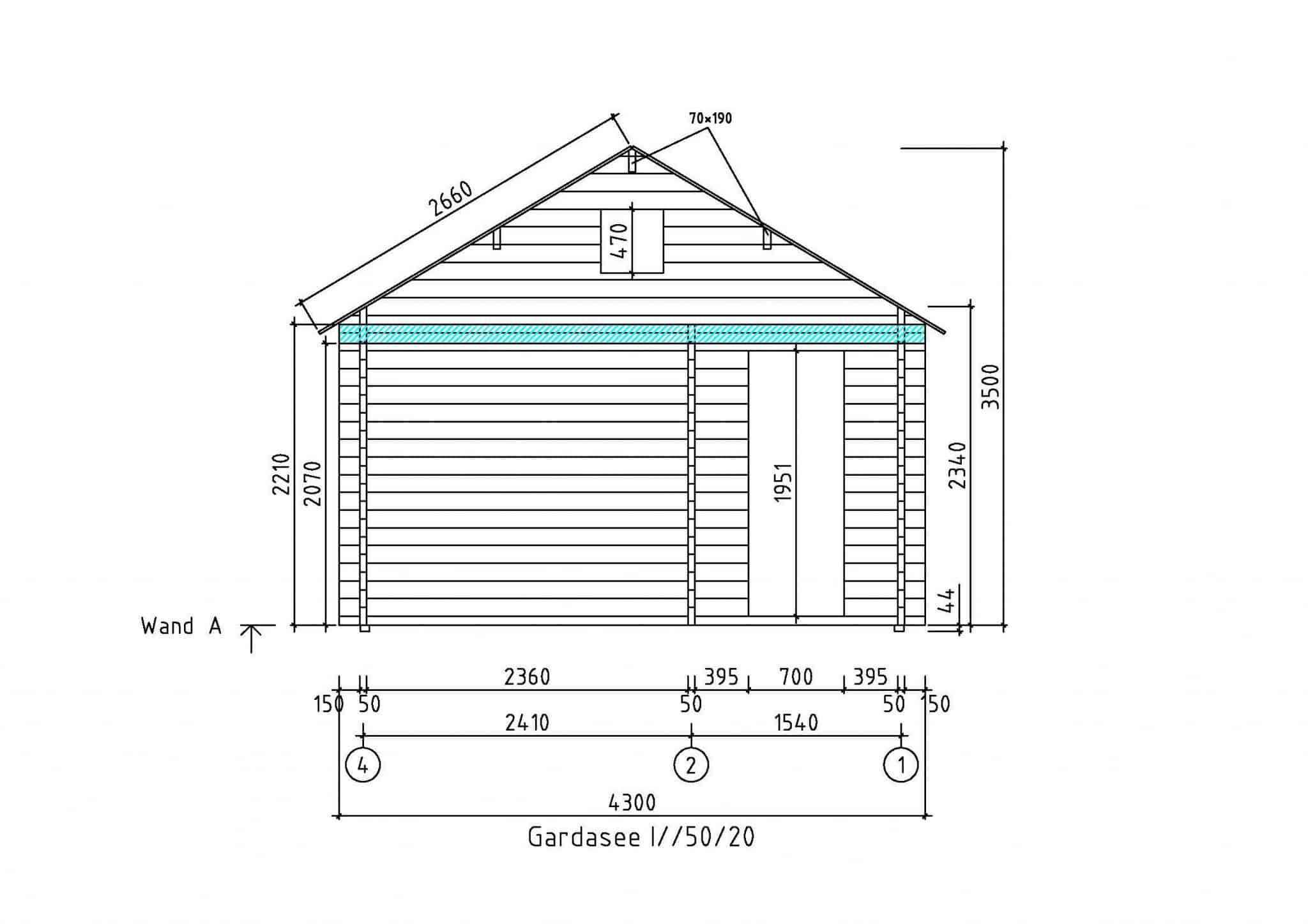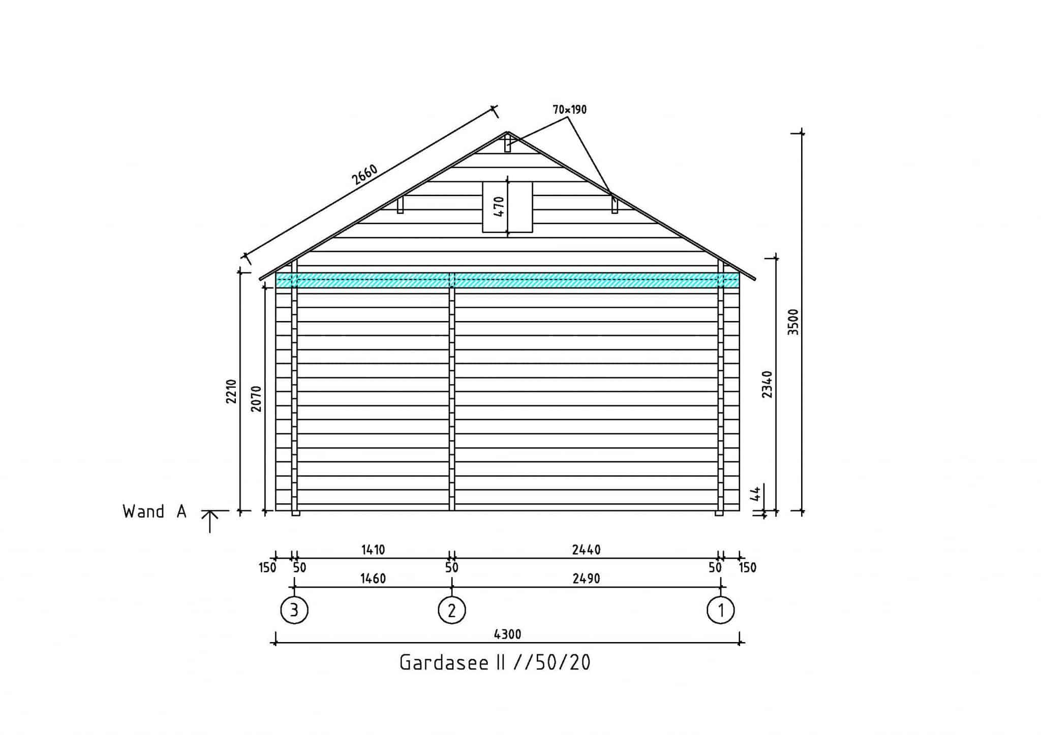 - ca. 3,50 m Firsthöhe, ca. 2,34 m Seitenwandhöhe