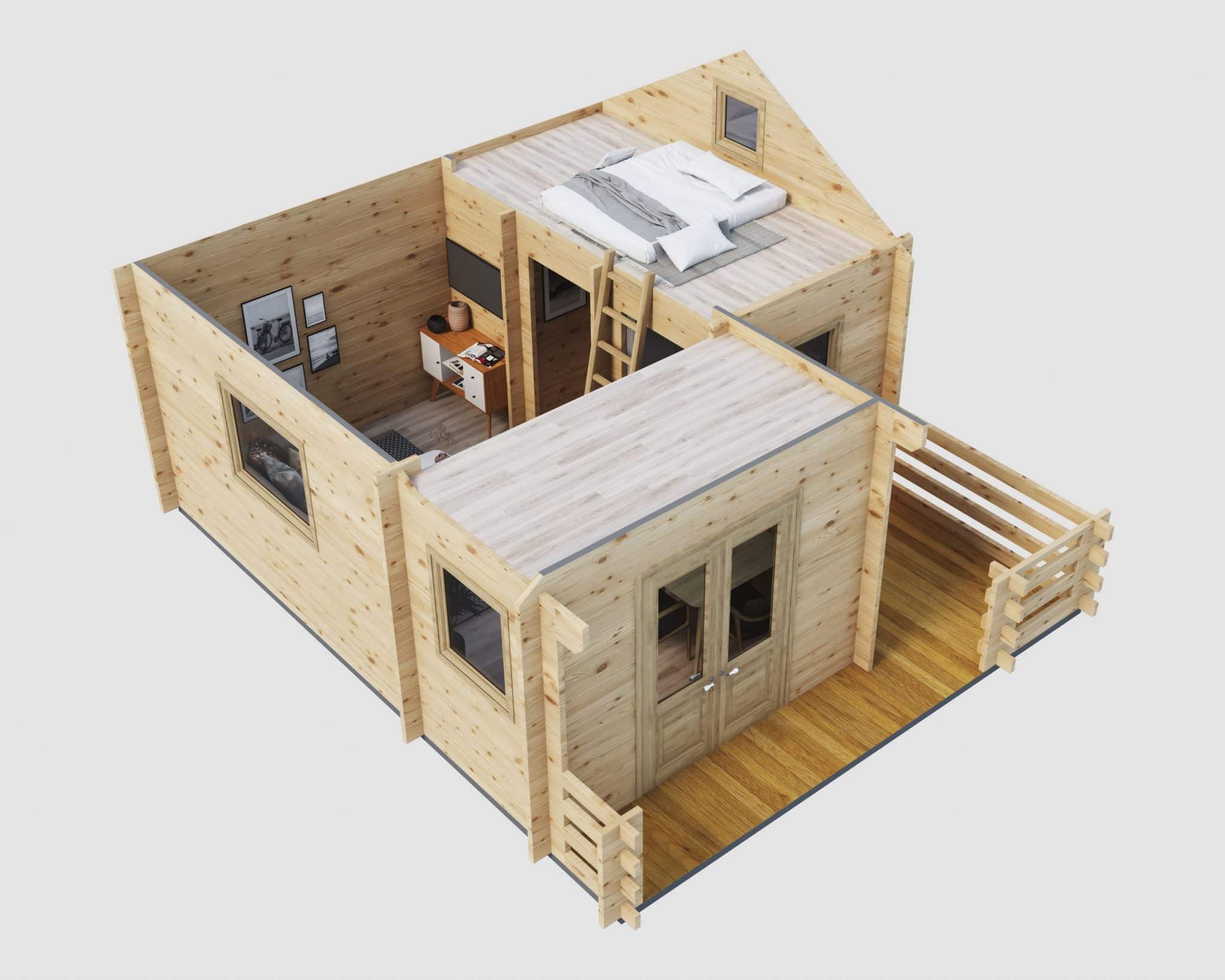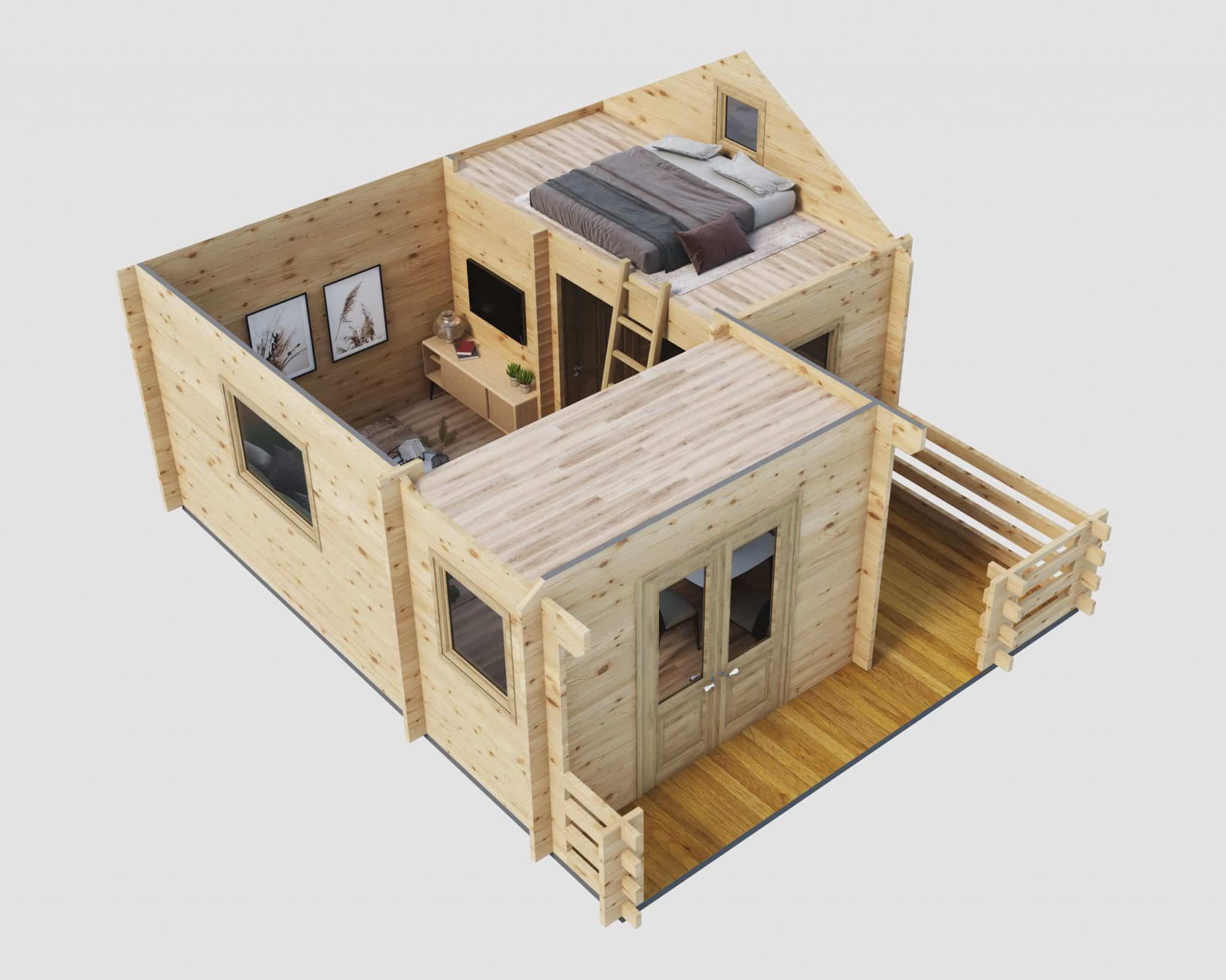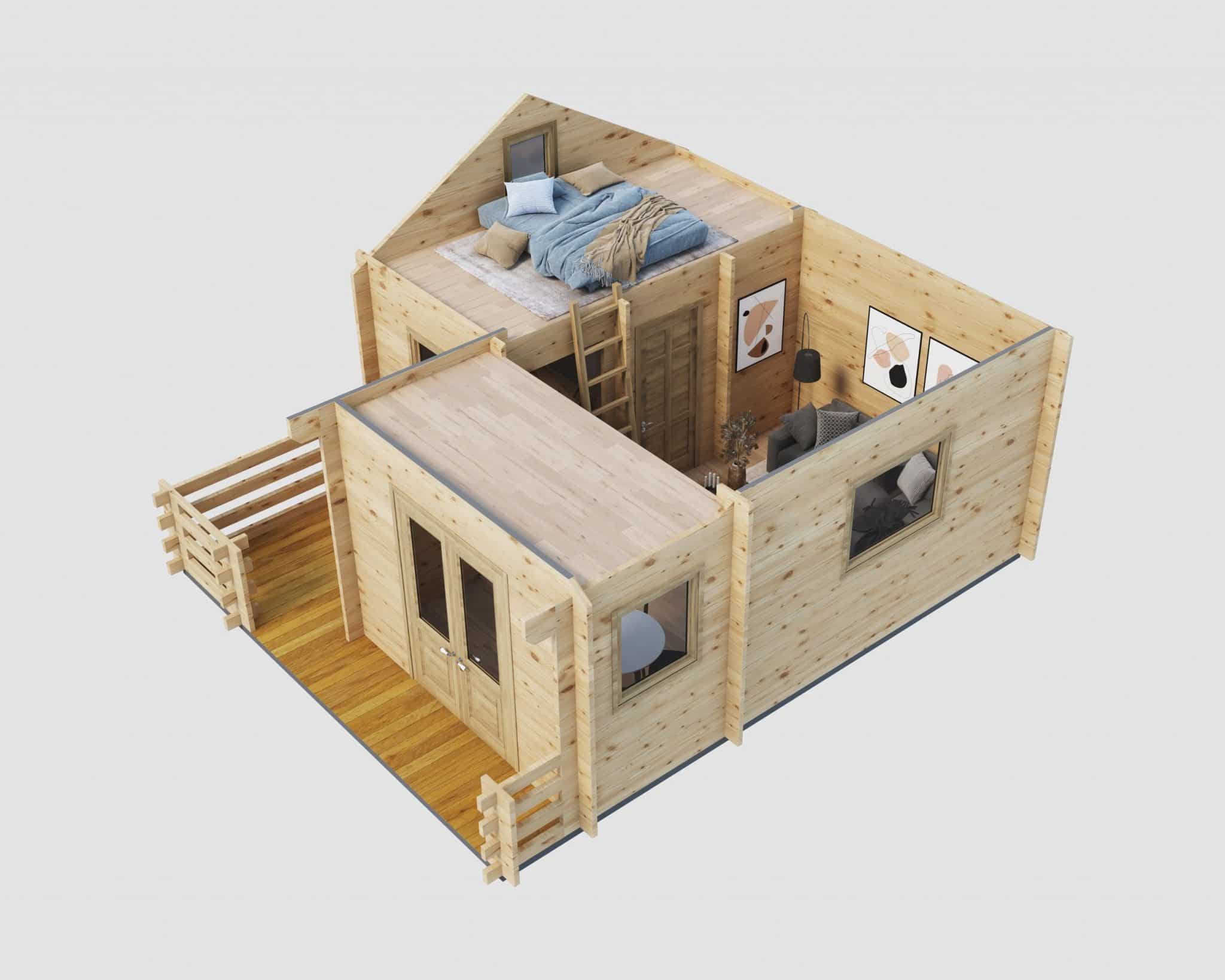 Unser gemütliches Holzhaus „Schweden“ hat eine Grundfläche von 24 m². Obwohl es kompakt ist, besticht es durch seine feine Blockbohlenbauweise mit 50 mm starken Blockbohlen. Mit einer Firsthöhe von 3,50 m und Seitenwänden von 2,34 m Höhe bietet es besondere Merkmale. Es verfügt über zwei kuschelige Schlafböden, die über separate Leitern zugänglich sind, und einen Freisitz für sonnige Tage.