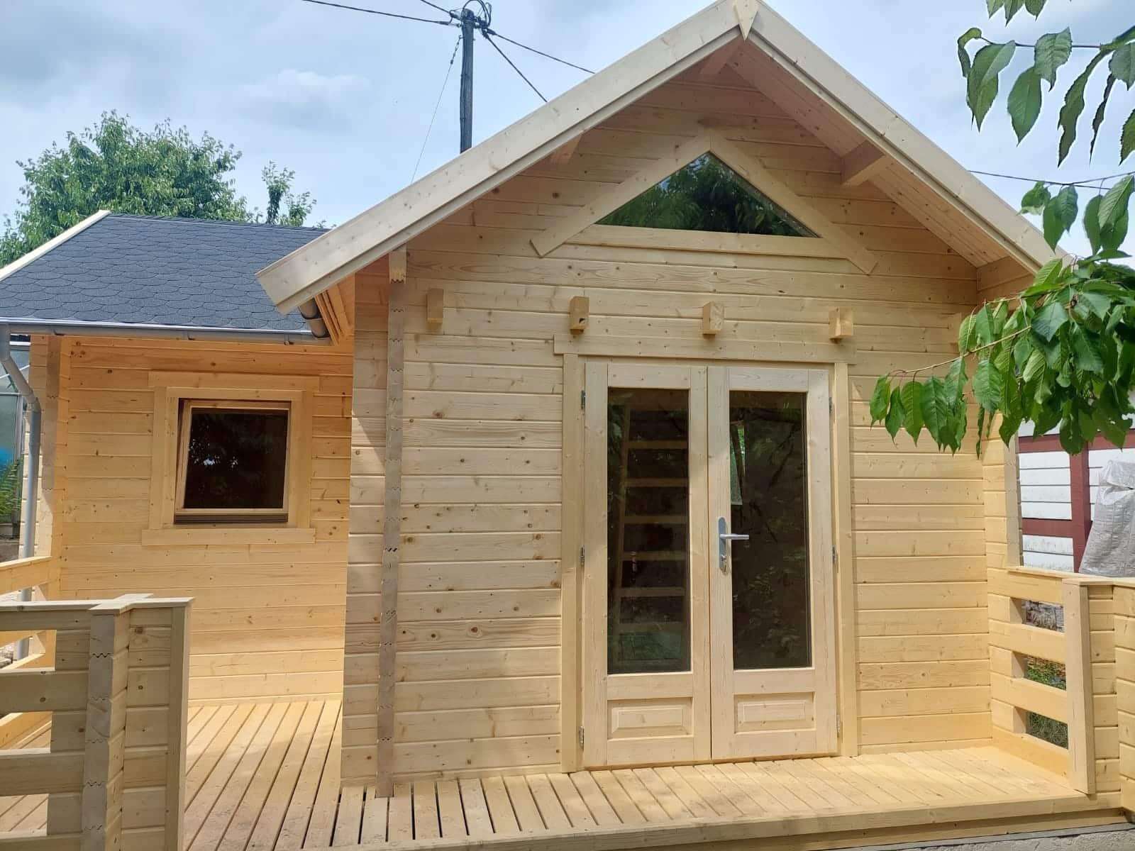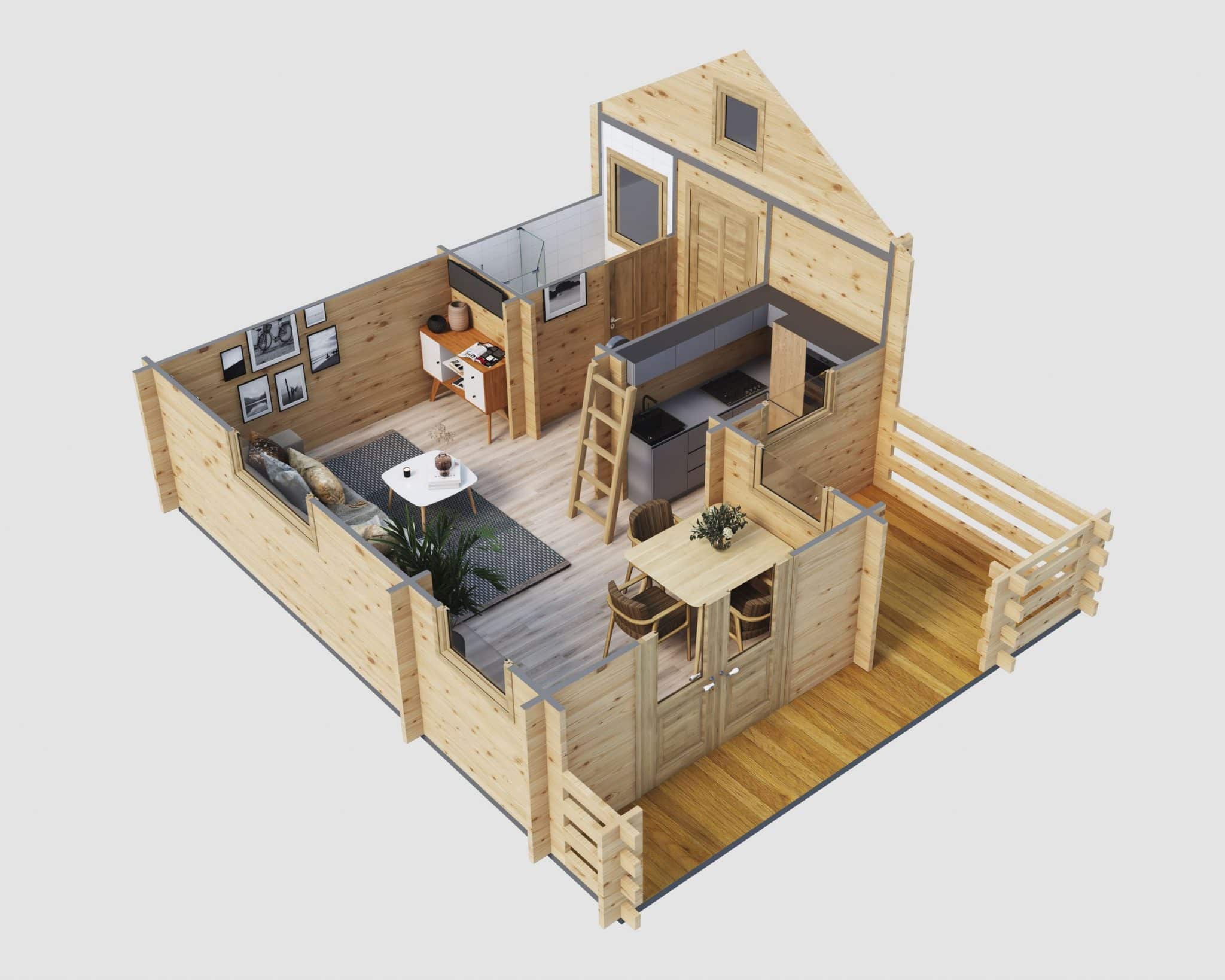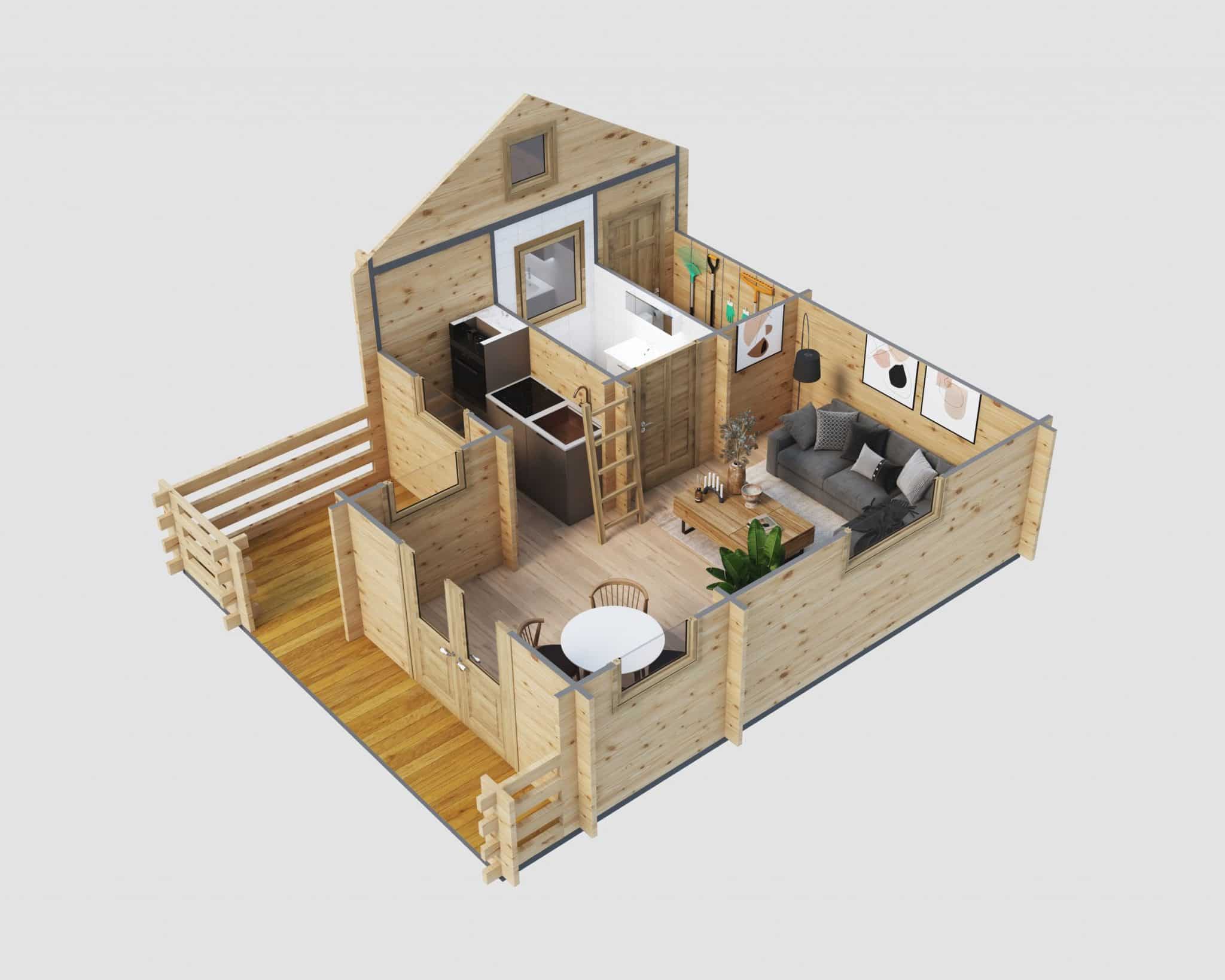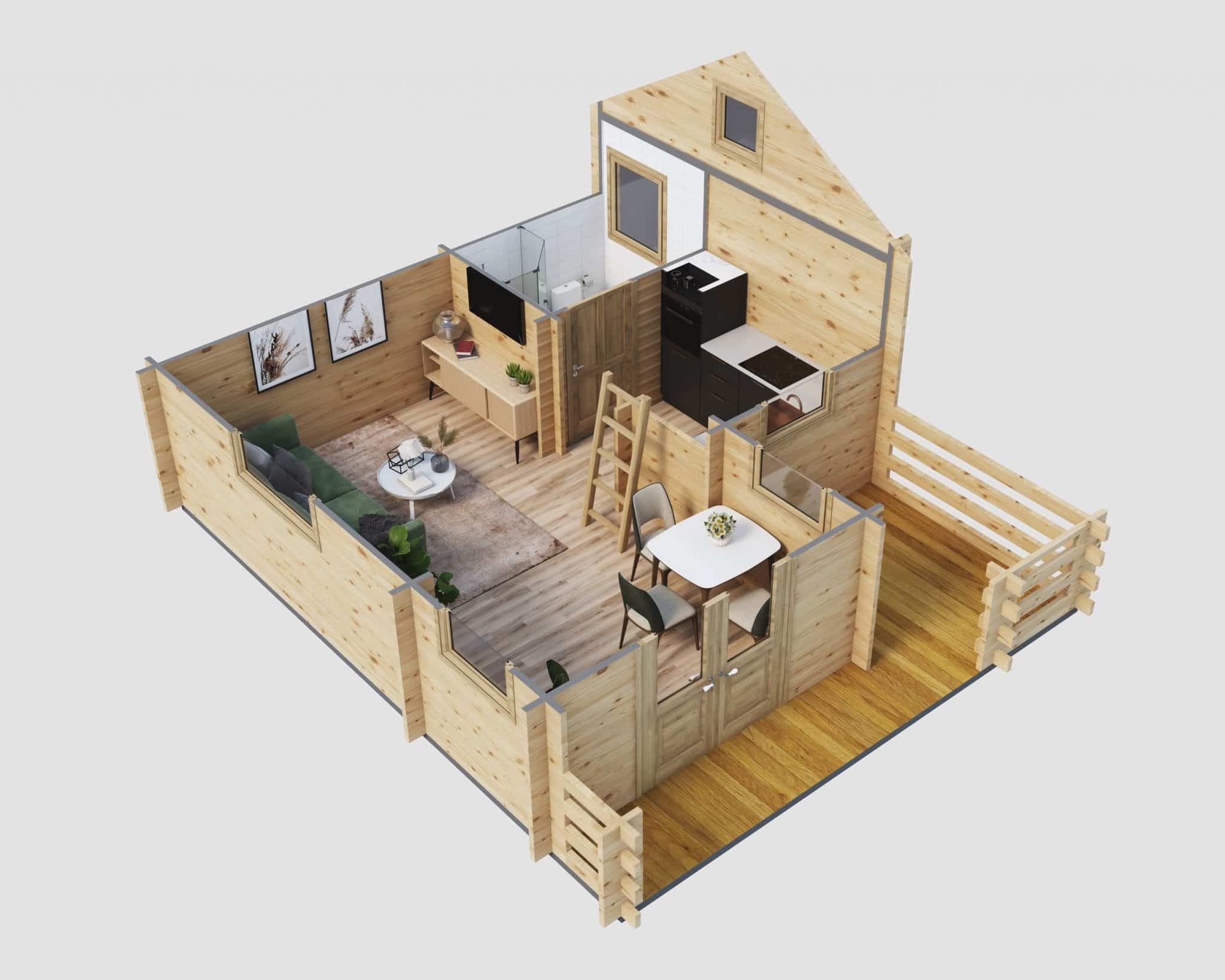 Unser gemütliches Holzhaus „Schweden“ hat eine Grundfläche von 24 m². Obwohl es kompakt ist, besticht es durch seine feine Blockbohlenbauweise mit 50 mm starken Blockbohlen. Mit einer Firsthöhe von 3,50 m und Seitenwänden von 2,34 m Höhe bietet es besondere Merkmale. Es verfügt über zwei kuschelige Schlafböden, die über separate Leitern zugänglich sind, und einen Freisitz für sonnige Tage.