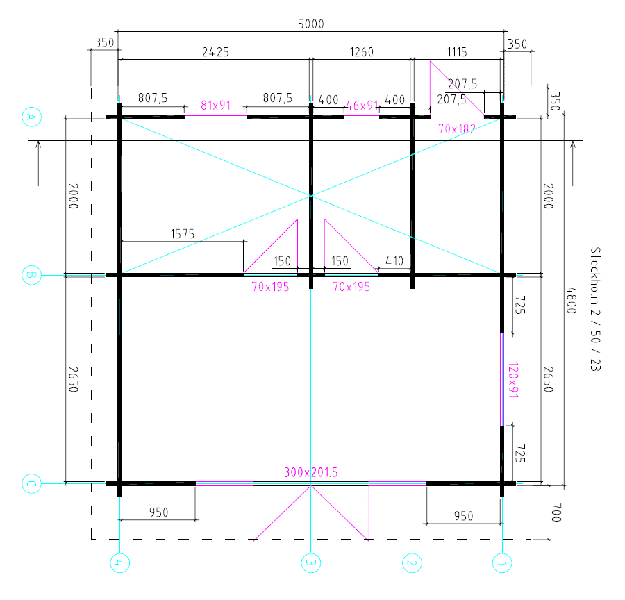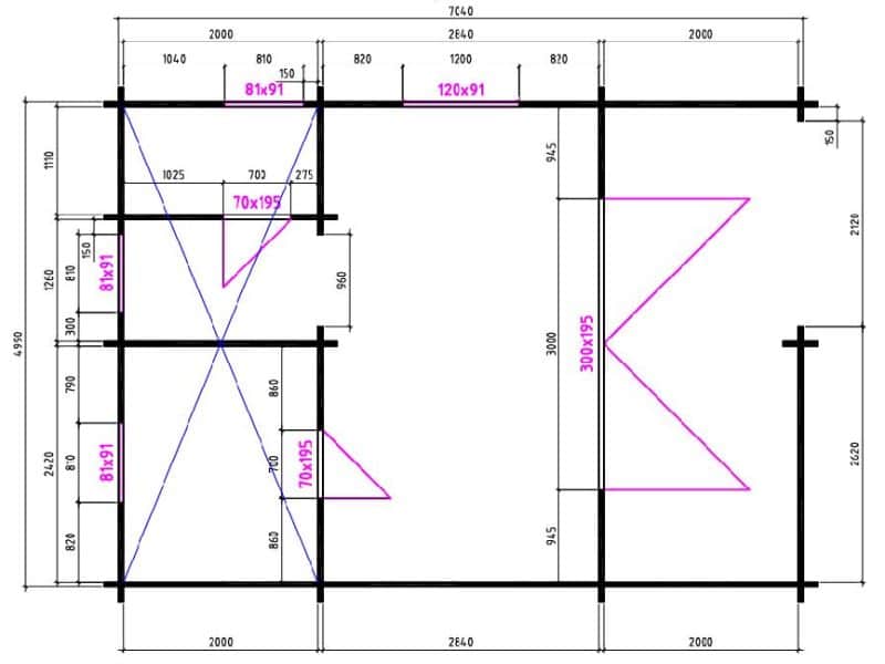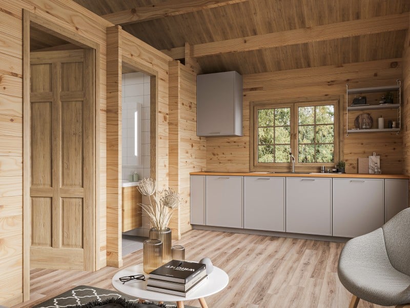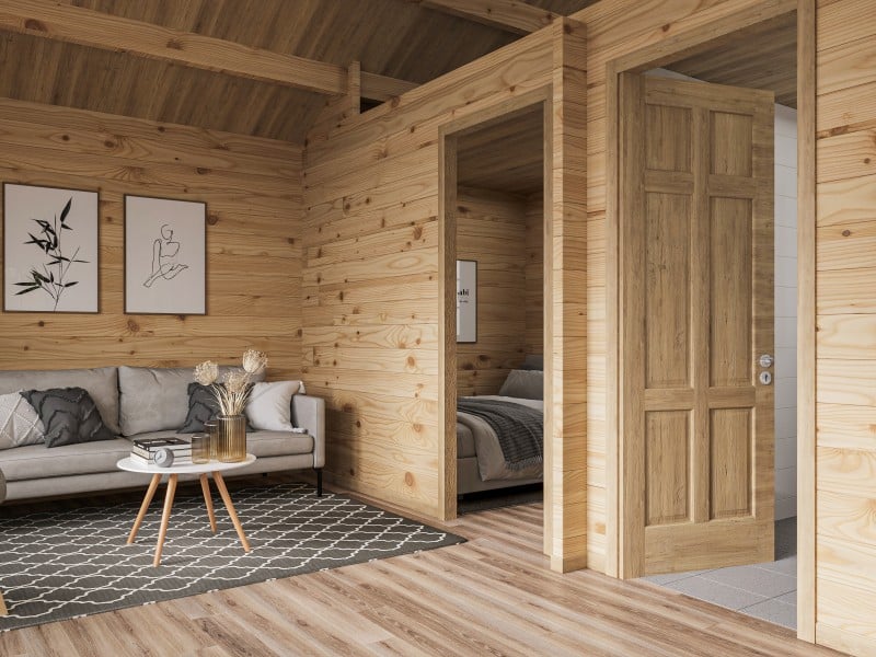 - 50 mm oder 70 mm Blockbohlenwände mit doppelt Nut und Feder